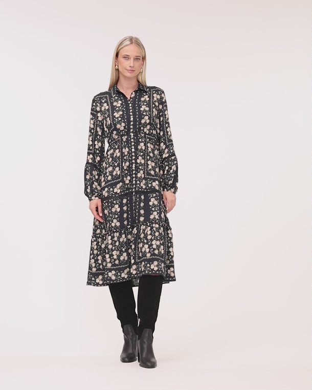 The Beverly Midi Dress brings effortless charm to your wardrobe with its vintage-inspired Wallpaper Floral print. Featuring a tiered silhouette, button-front placket, and classic collared neckline, this midi blends polish with ease. Long sleeves with subtle gathers add a touch of romance, while the flowy skirt moves beautifully with every step. Designed in a timeless navy base with soft neutral florals, it’s the perfect dress for everyday wear, weekend outings, or seasonal gatherings.