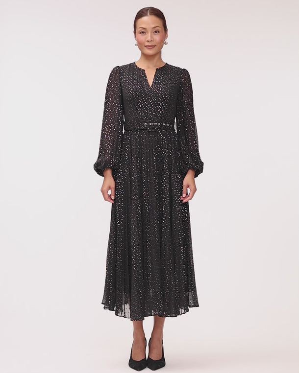 Shimmer and shine in the most sophisticated way with our Maybelle Belted Midi Dress in Foil Dot. Designed to make every occasion feel special, this elegant black midi dress features delicate gold foil dots that catch the light with every step. The silhouette flatters effortlessly, with a softly pleated skirt, a cinched waist accented by a matching removable belt, and sheer blouson sleeves that add a touch of romance.