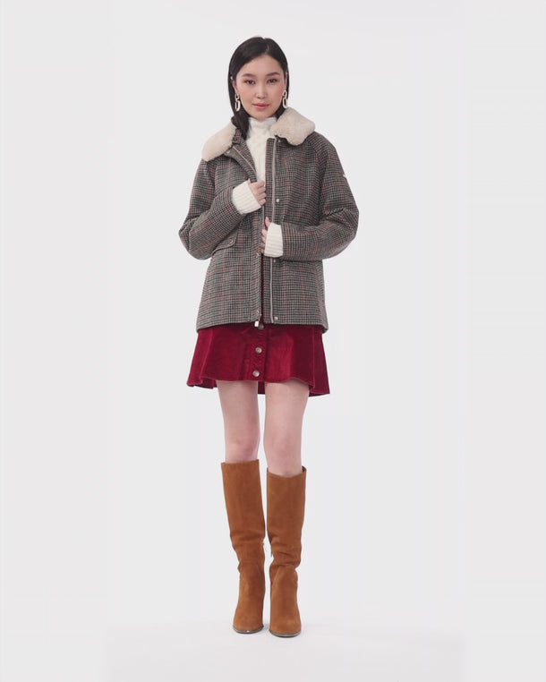 Tailored and timeless with a cozy twist. Our Mini Check Cropped Barn Jacket features a classic tan plaid, gold-tone buttons, and flap front pockets—all topped with a removable faux shearling collar for added warmth and versatility. Made from a soft, structured blend, it's an easy layer that instantly pulls any outfit together. Pair with denim and boots for a polished fall look or layer over dresses to soften the structure with a feminine finish.