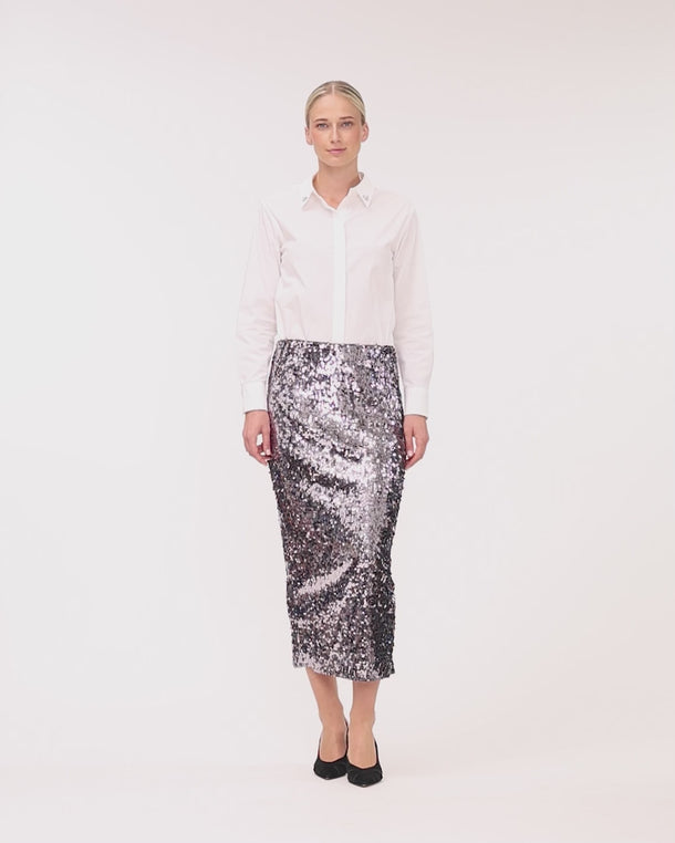 Turn every occasion into a celebration with our stunning Sequin Midi Skirt. Designed to shimmer with every step, this statement piece features thousands of light-catching sequins that create a glamorous, mirror-like finish. The sleek midi length offers a sophisticated silhouette, while the soft inner lining ensures a comfortable, smooth fit from day to night.