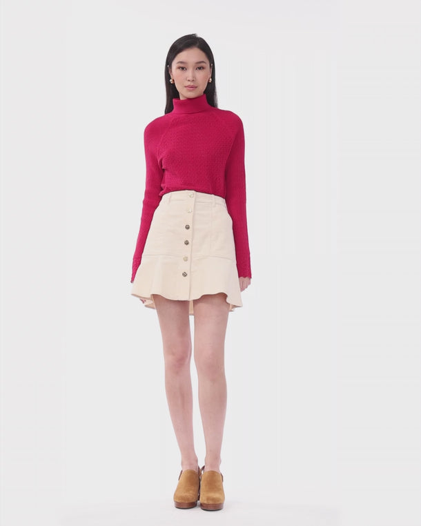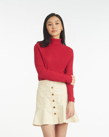 A modern take on a timeless knit. The Lace Stitch Pullover is designed with delicate open-weave detailing that gives it an airy, feminine finish. A slim mock neck and scalloped cuffs add subtle sophistication, while the soft rayon-blend yarn makes it lightweight yet cozy. Easy to dress up or down, this pullover layers beautifully under blazers or stands on its own with denim.
