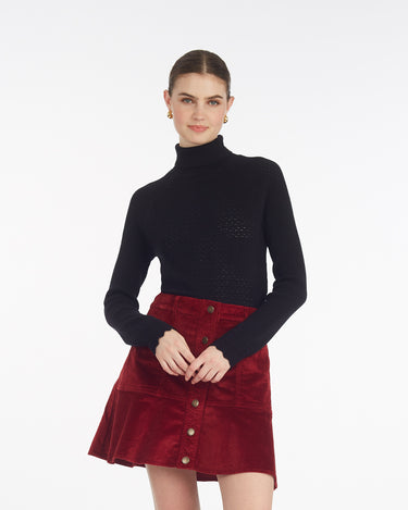A modern take on a timeless knit. The Lace Stitch Pullover is designed with delicate open-weave detailing that gives it an airy, feminine finish. A slim mock neck and scalloped cuffs add subtle sophistication, while the soft rayon-blend yarn makes it lightweight yet cozy. Easy to dress up or down, this pullover layers beautifully under blazers or stands on its own with denim.