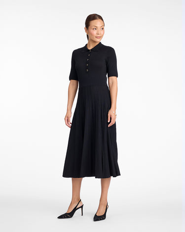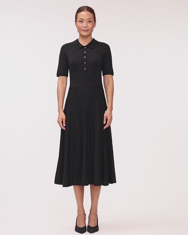 The Collared Midi Dress is a modern classic designed for effortless sophistication. Featuring a polo-style collar with button-front detailing, short sleeves, and a ribbed knit bodice that transitions into a pleated midi skirt, this dress offers both structure and movement. Crafted in timeless black, it’s a versatile piece that can be dressed up with heels or styled casually with flats and boots. Comfortable yet polished, this midi dress is your go-to for work, dinner, and every occasion in between.