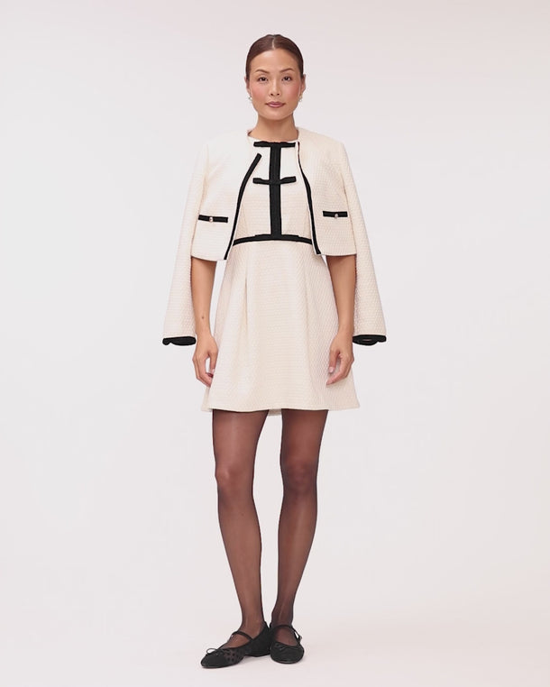 Polished and perfectly feminine, the Sarabeth Tweed Mini Dress is a timeless piece with modern charm. Designed in textured tweed with contrast velvet bows, this sleeveless mini features a flattering bell-shaped skirt that moves beautifully. Pair it with tights and flats for a chic daytime look or dress it up with heels for your next soirée.
