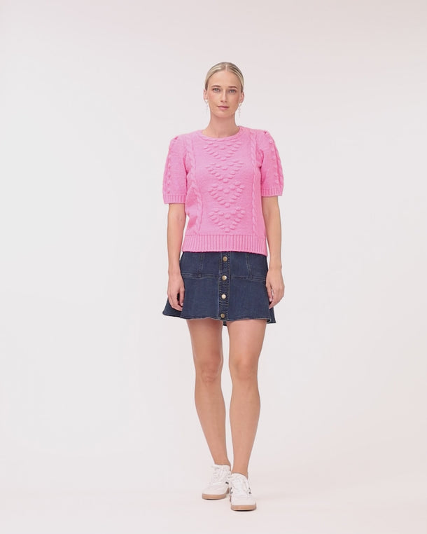 The Heart Sweater in bright pink is cozy, cheerful, and full of charm. Designed with a playful textured heart knit pattern and subtle puff sleeves, it’s a fun twist on a classic knit. The short sleeves make it versatile for layering or wearing on its own, while the soft knit keeps it comfortable all day long. Feminine, stylish, and easy to pair, this sweater is the perfect way to add a pop of personality to your wardrobe.