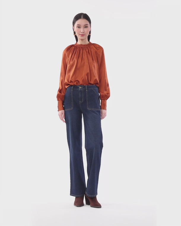 Our hammered satin blouse is all about understated drama. Designed with a gathered crewneck, graceful drape, and softly bloused sleeves finished with covered buttons, it’s the kind of top that makes even denim feel dressy. The rich rust hue gives it warmth and depth—perfect for fall and holiday, but equally striking year-round. Style it tucked, half-tucked, or loose—it’s polished no matter what.