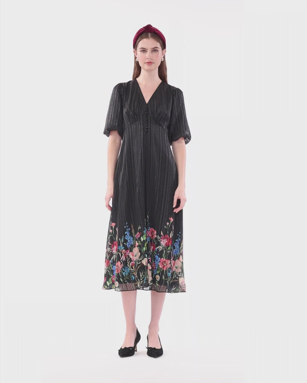 A dress made to turn heads—this midi features a dreamy floral border that feels like a garden in motion. The V-neckline, covered buttons, and floaty sleeves add a romantic finish to the elegant silhouette. Perfect for weddings, soirées, or any moment you want to feel extra special.
